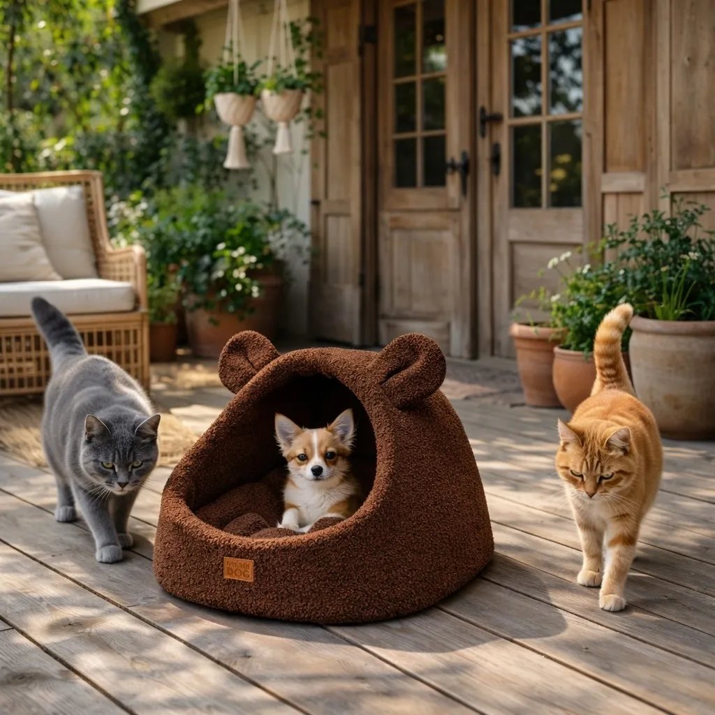 This model is made from high‑quality bouclé fabric with a soft, looped texture. The material is pleasant to the touch, warm and stylish, fitting beautifully into modern, Scandinavian, boho and natural interiors. Inside, the house features a warm, soft cushion that provides excellent comfort all year round.