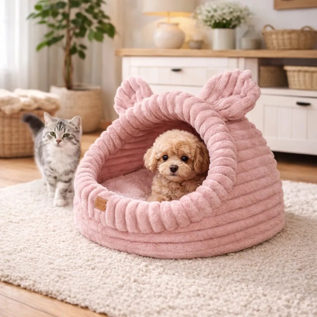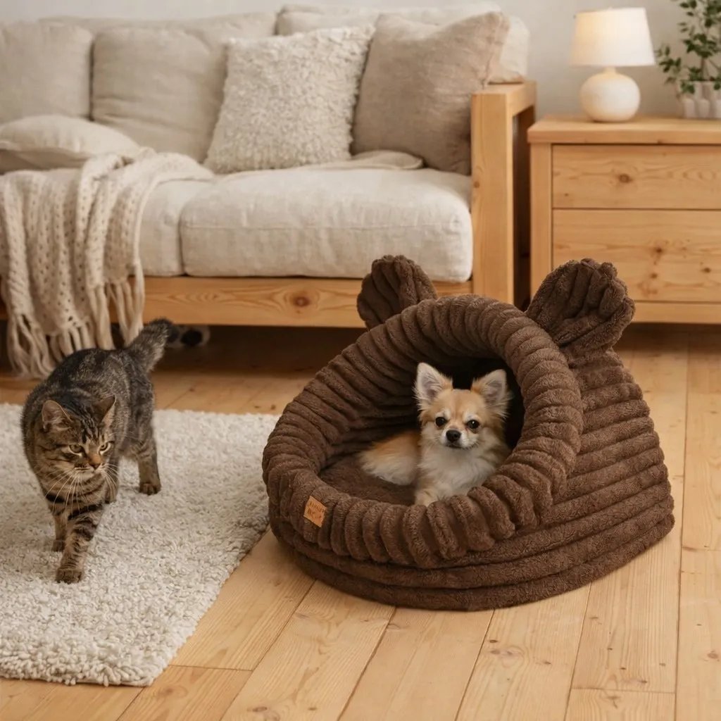 The house is made from high‑quality corduroy fabric — durable, stylish and pleasant to the touch. Inside, a warm, soft cushion provides excellent comfort all year round.