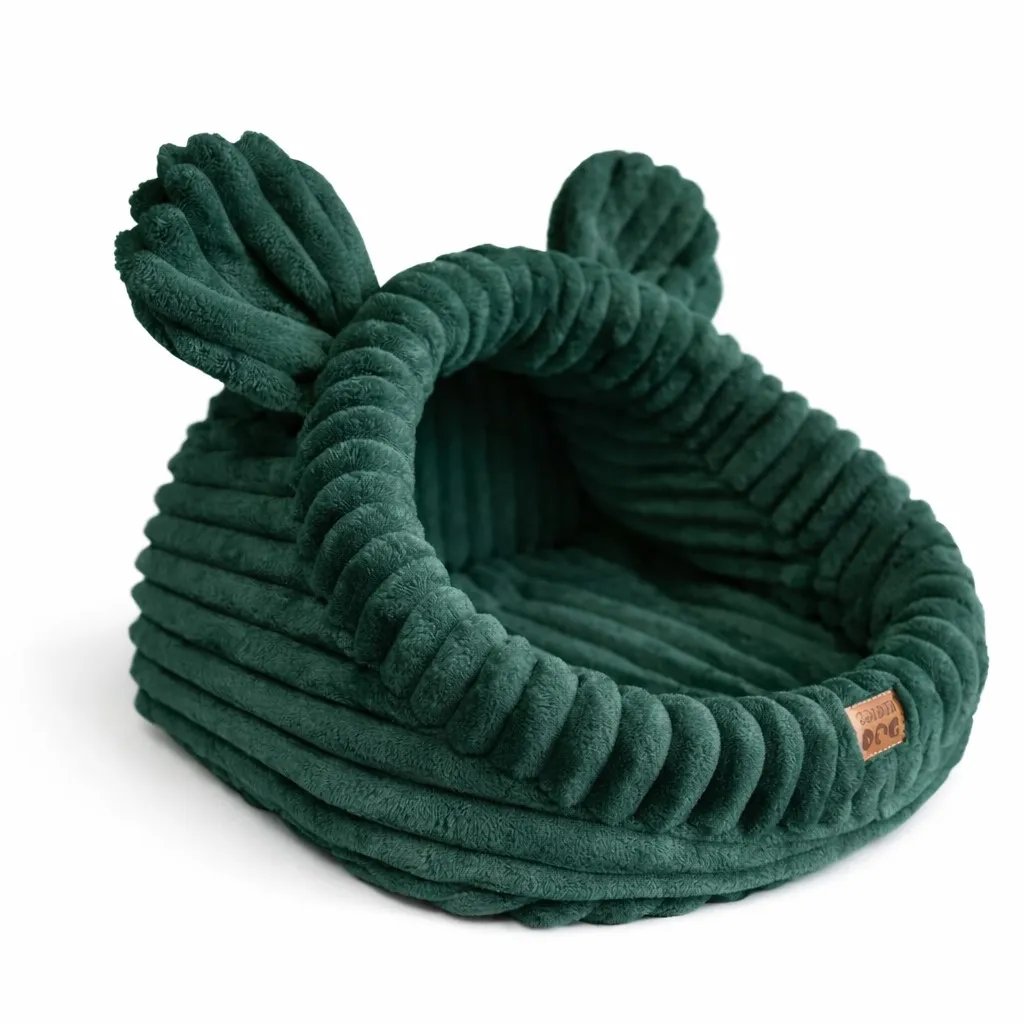 The corduroy bottle green pet house with cushion (sizes M and L) is a cosy and secure bed for dogs and cats who enjoy peace, warmth and a sense of safety. Its enclosed structure creates a comfortable hideaway that helps pets relax and unwind, especially those sensitive to external stimuli.