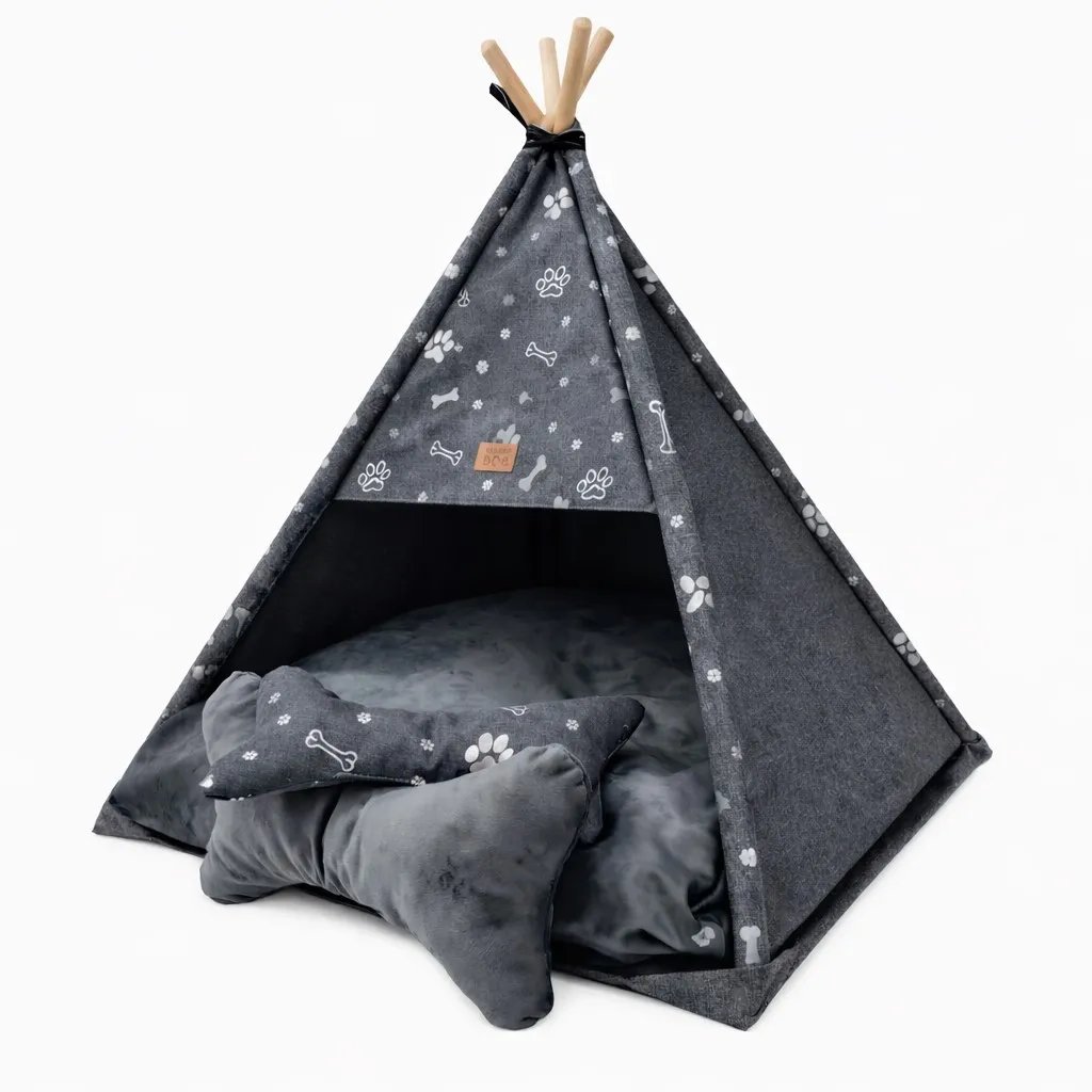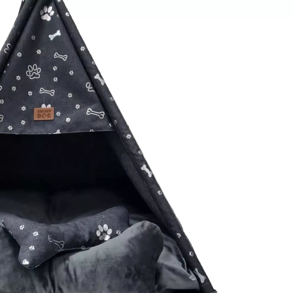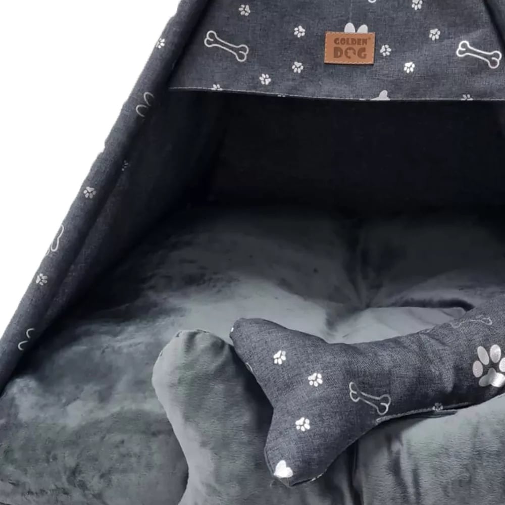 The Teeppe dog bed in silver paws print fabricwill be the perfect resting place for your pet. Your dog or cat will love its bed in this unusual shape. Our teepee is made from the highest quality waterproof polyester. It comes with a comfortable cushion that can be removed. The cushion features a removable cover, which can also be washed. The cushion is filled with fluffy polyurethane foam that does not lose its shape under the weight of the animal. The foam ensures good air circulation. The cover is made from a soft, blanket-style fabric.