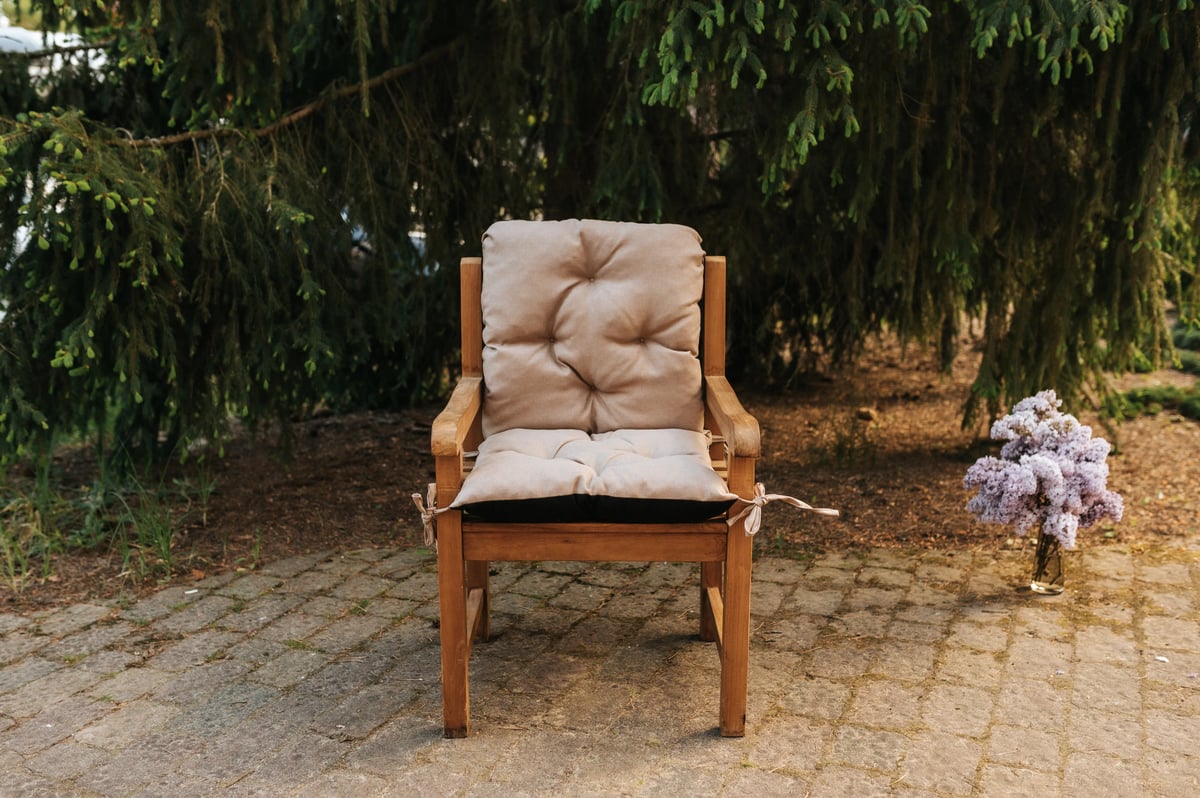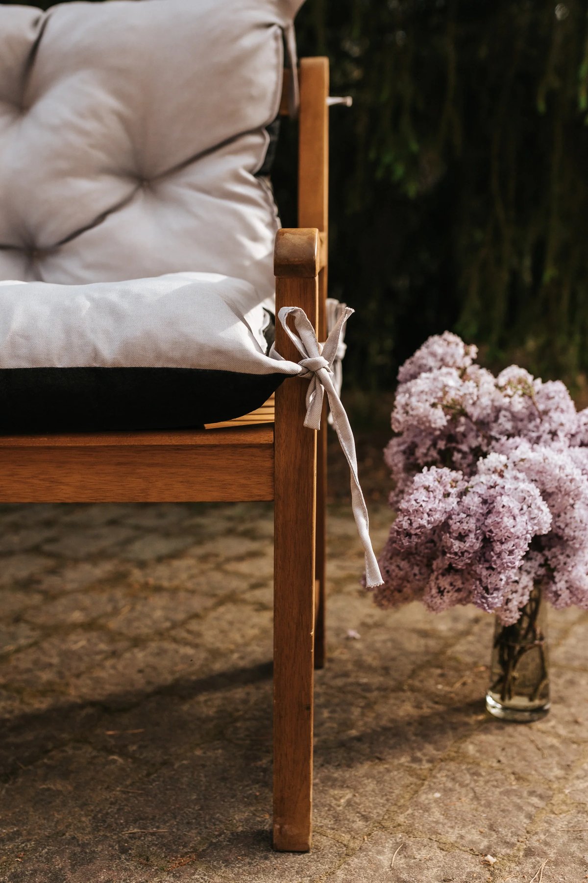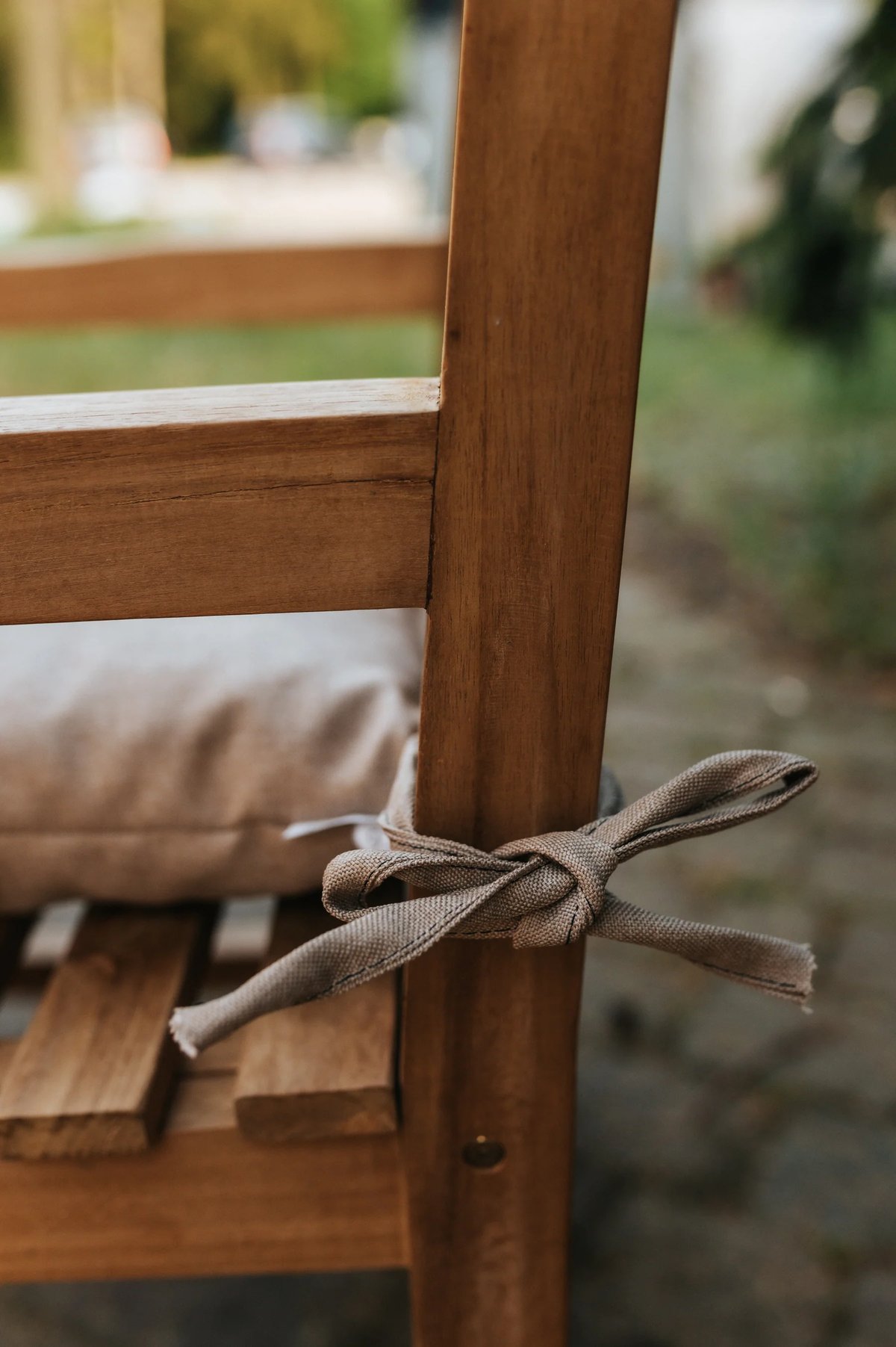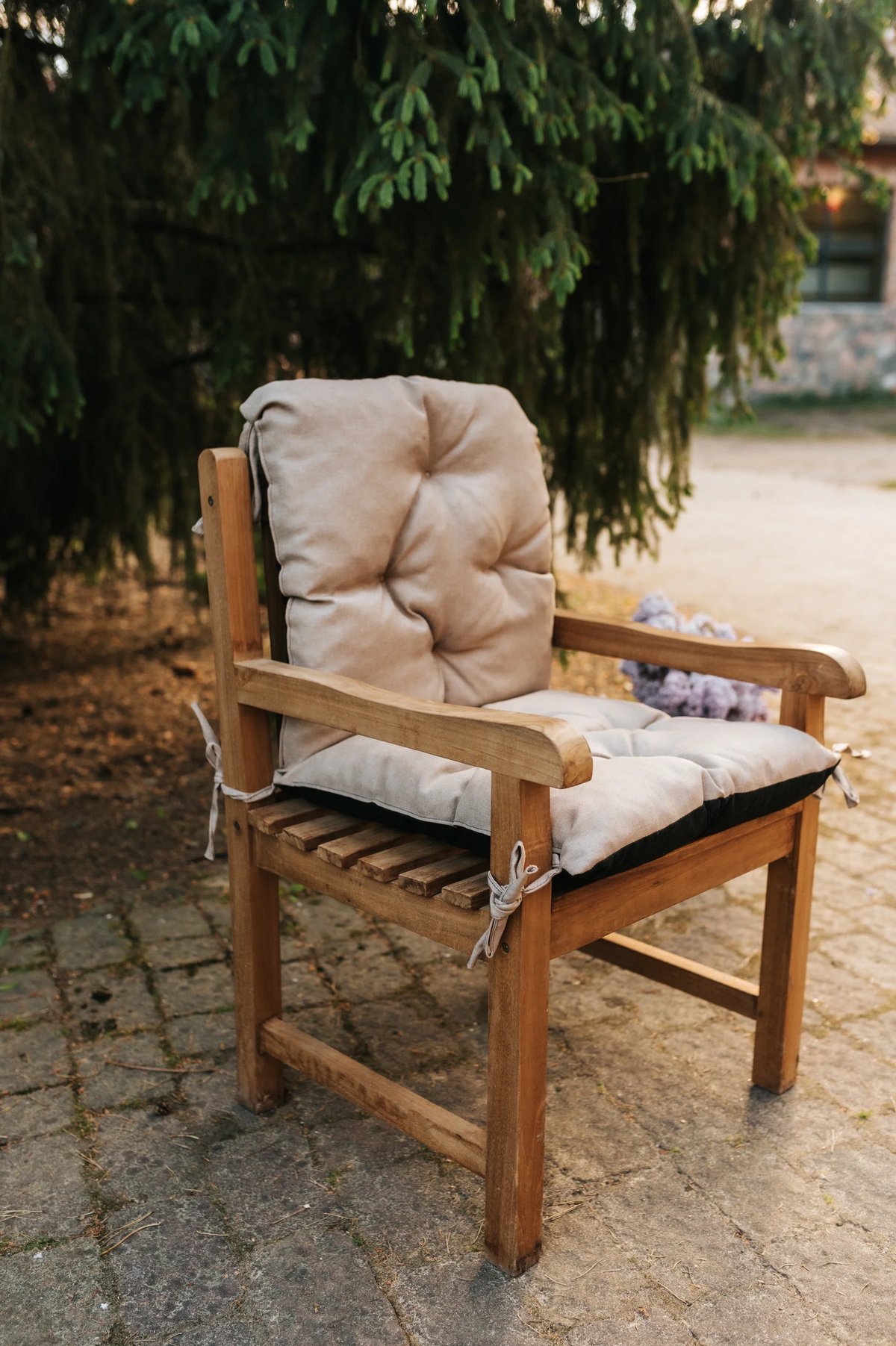 Tie straps at the top and a securing string at the bottom keep the cushion firmly in place. This prevents slipping, which is especially helpful on wooden or unupholstered garden chairs.
